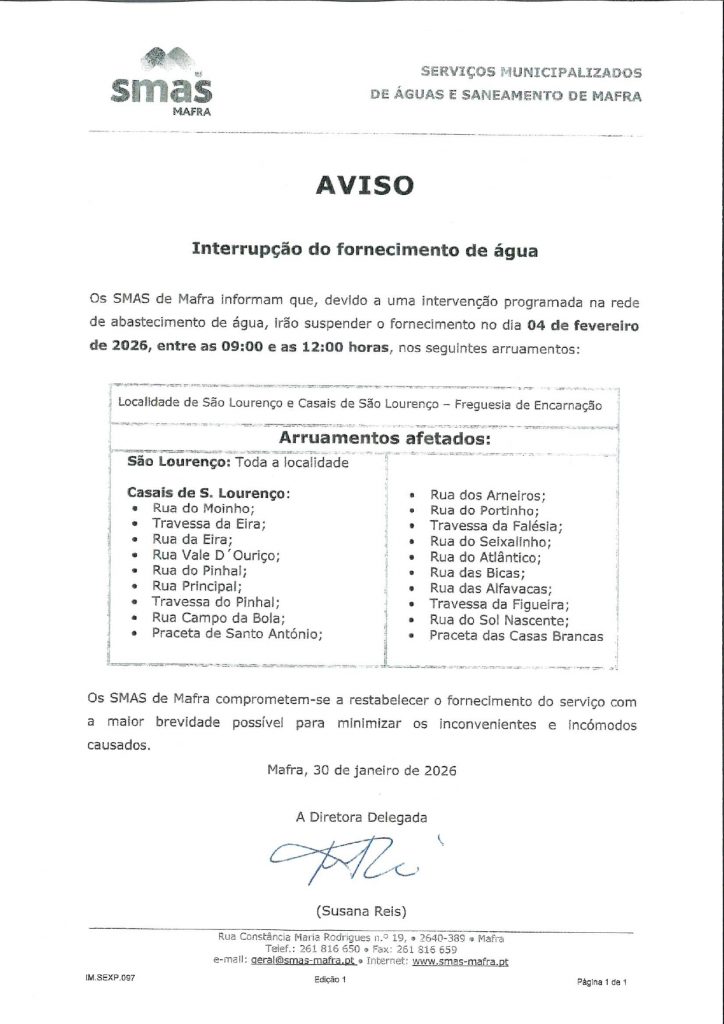 AVISO – SMAS Interrupção do fornecimento de água